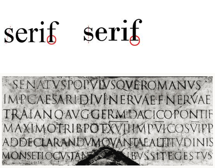 筆畫末端付加油爪狀或者線條叫襯線,據說襯線有助于水平方向的視線移動,所以小說等正文排版中會更多的使用傳統造型的羅馬字體。文藝復興時期到巴洛克時期的老羅馬體,18世紀后具有直線型襯線的現代羅馬體。