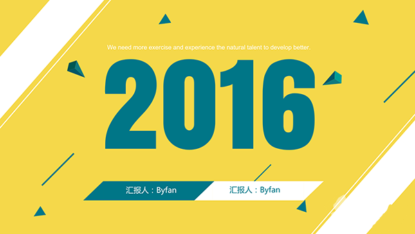 另一個例子,這個PPT的封面通過明亮的檸檬黃色和零碎的幾何形狀來強調他們的歡快。