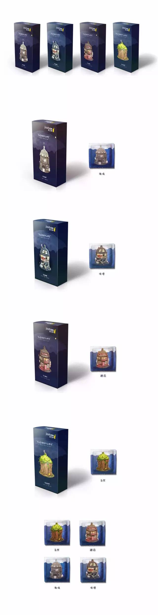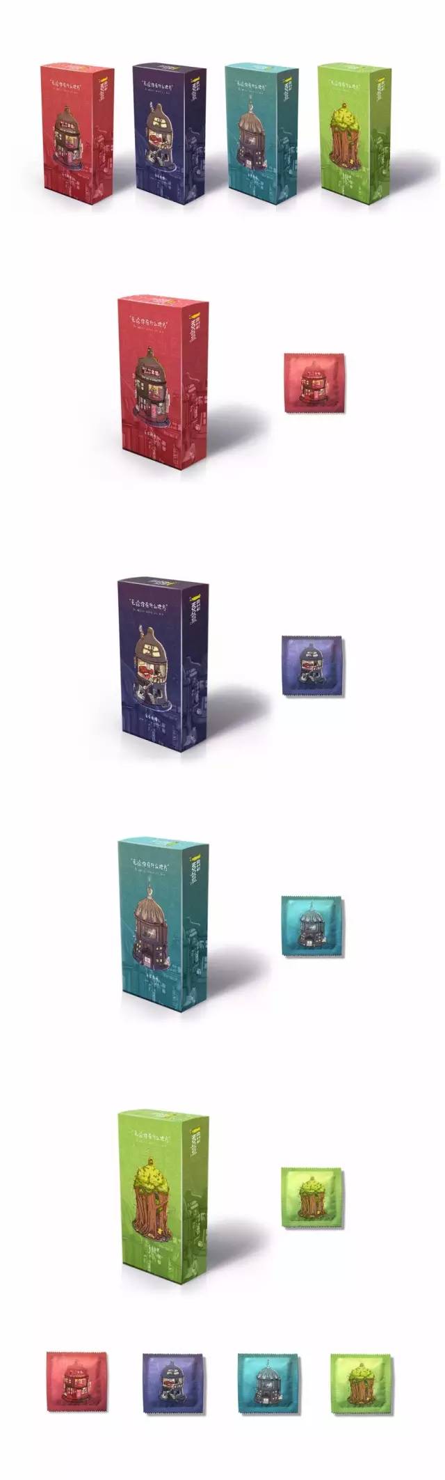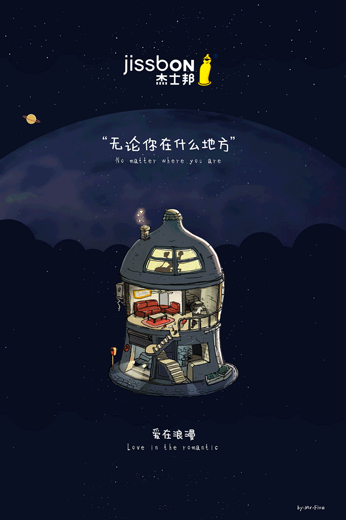 無論你在什么地方,在家里、在公司、在賓館、在刺激的野外……以套套的形狀將這幾個代表性的地點(泛指任何地點)表現出來。這幾個地點(建筑物和小樹林)都象征著套套,在每個地點(每個套套)里面都上演著不同的情景、迸發不同的激情,但都享受著這“套套”給予的安全保障。