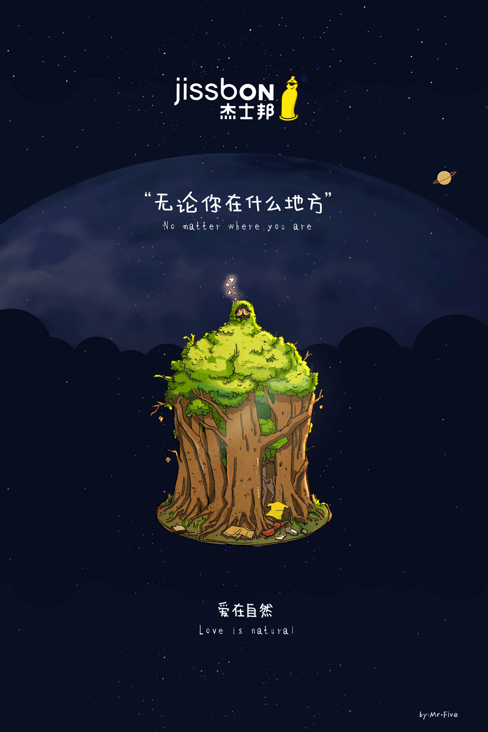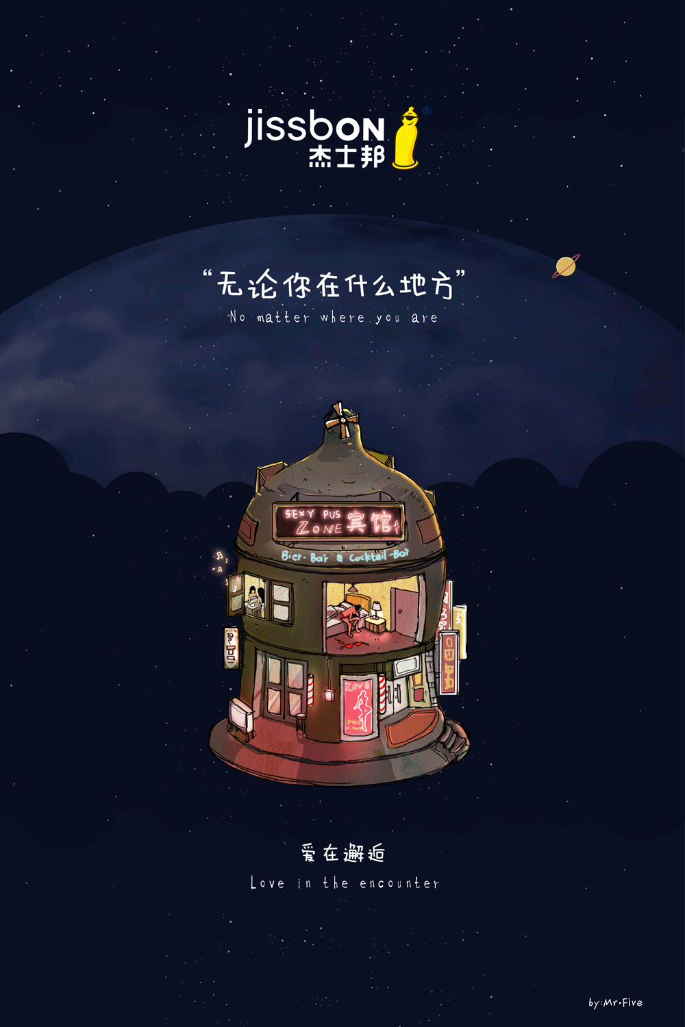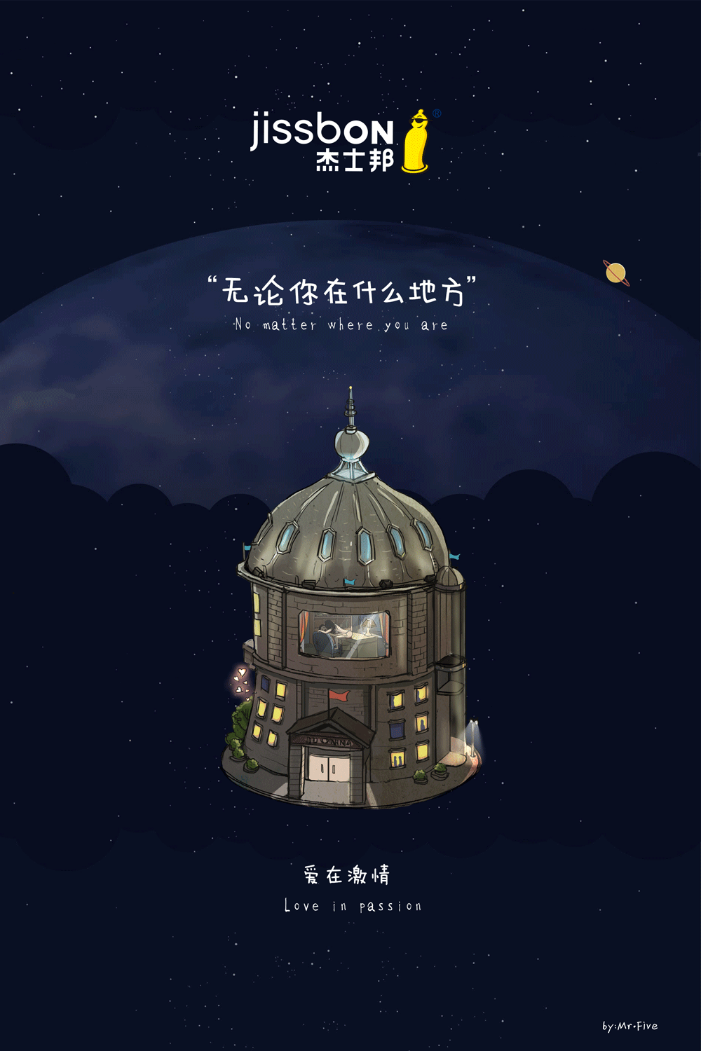 無論你在什么地方,在家里、在公司、在賓館、在刺激的野外……以套套的形狀將這幾個代表性的地點(泛指任何地點)表現出來。這幾個地點(建筑物和小樹林)都象征著套套,在每個地點(每個套套)里面都上演著不同的情景、迸發不同的激情,但都享受著這“套套”給予的安全保障。