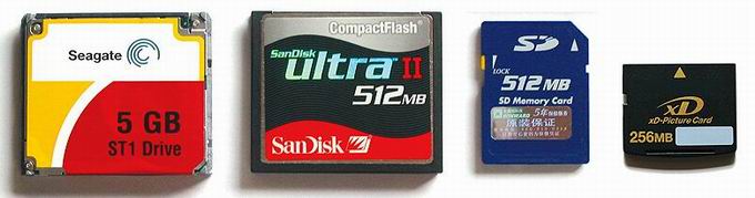 從左至右:硬盤式CF(容量大,但速度稍慢),高速CF(速度快),SD(體積小,速度快),XD(同SM類)
