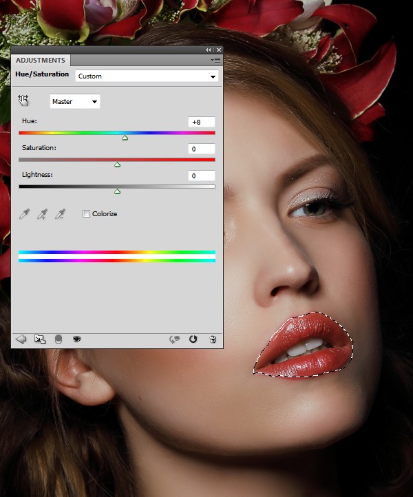 首先我們對嘴唇顏色進行修飾,使用多邊形套索工具(快捷鍵L)選擇出嘴唇,在圖層面板》新建調整層》選擇色相/飽和度,參數如圖(色相+8)。
