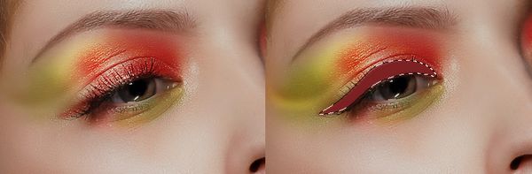 新建一個圖層,用鋼筆工具(P),在左眼的眼皮上創建一個形狀。按CTRL+ENTER,將形狀變為選區,并填充顏色#7e2224。圖層模式改為疊加,透明度50