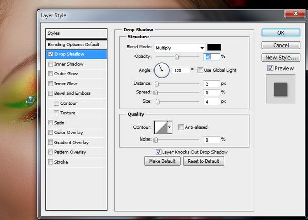 雙擊寶石層,彈出圖層屬性面板,設置投影,參數如圖。