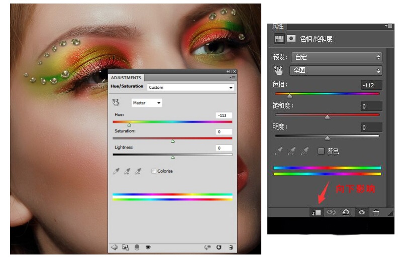 選中所有寶石圖層,按CTRL+G成組,將這個組群的模式設為正常,透明度100%,在圖層面板》使用調整圖層》色相/飽合度,調整寶石組(將調整層向下影響為僅針對寶石組,如下右圖)使其符合臉部的顏色。。