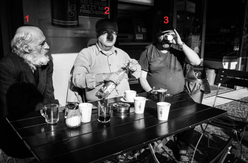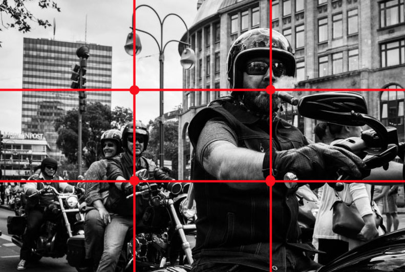 畫面中的四個點:左上、左下、右上、右下是放置焦點的理想區域。在街頭攝影中,使用頂部坐標點能讓畫面主題更加豐富,并聚焦。