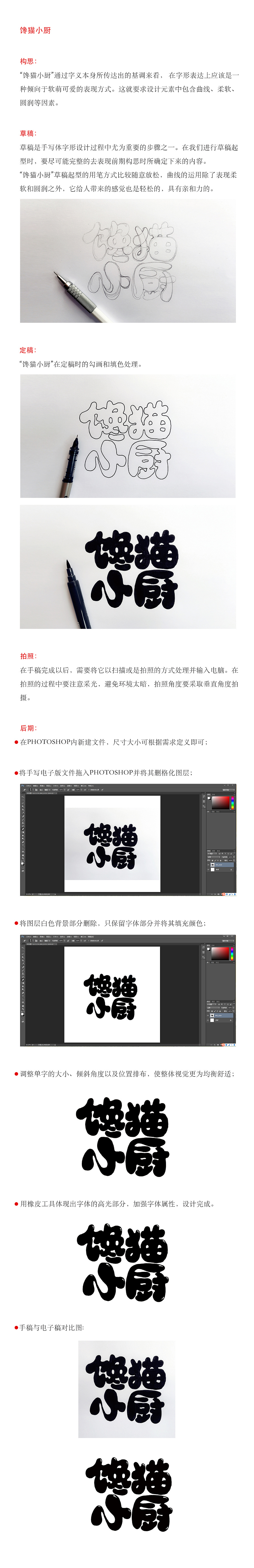1912編者,這次推出的是字體設計與字體設計欣賞。首先我們先用一個例子,“饞貓小廚”,下面這是在設計“饞貓小廚”的構思,和設計過程的展示。