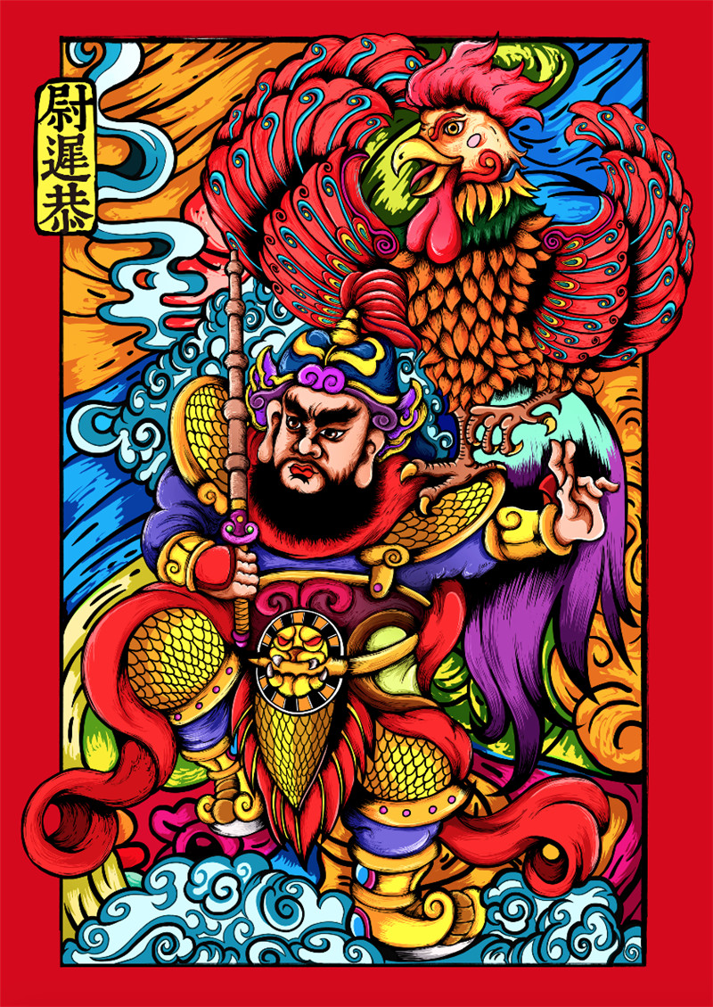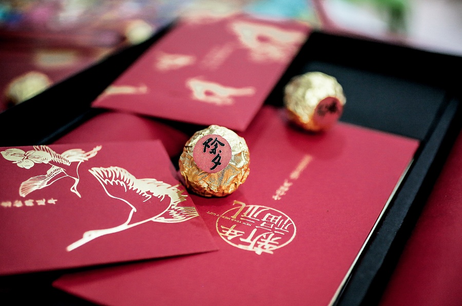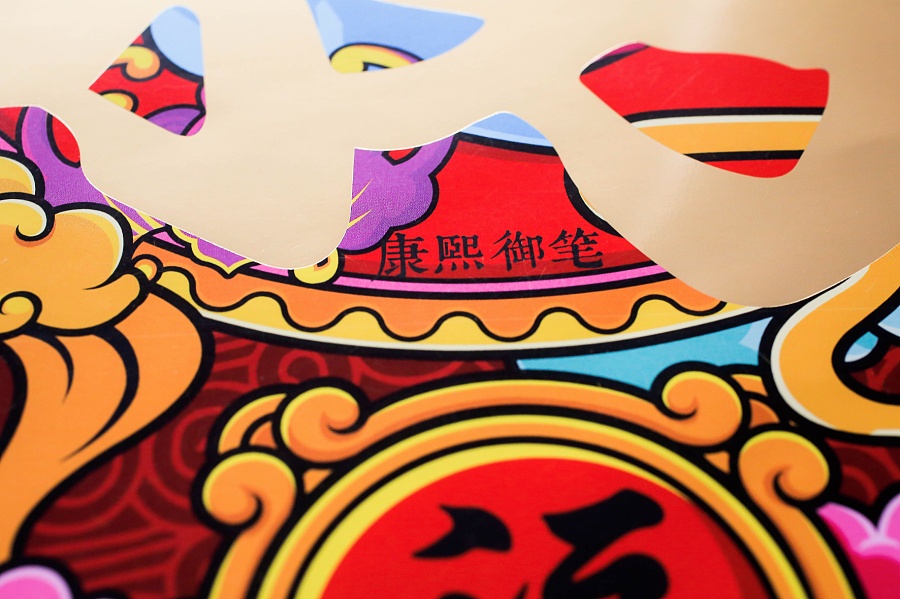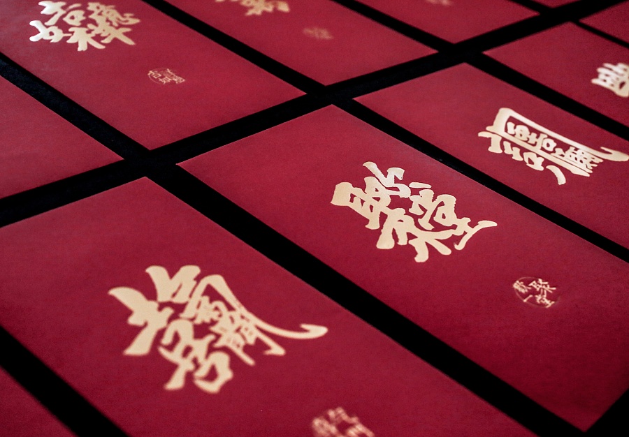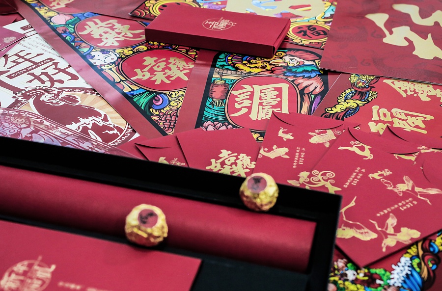 當人們開放禮盒的一瞬間,以“開門見喜”大信封的形式表現過年喜氣洋洋的氣氛。信封內裝有2017雞年日歷海報、新春小貼紙與雞年主題窗花。整個禮盒分為3層,第二層裝有對聯、福字、門神、灶神與財神,插畫師運用幽默而不失傳統的表現手法來表達人們傳統心目中的“門神、灶神與財神”形象。“福字”數量為5張,對應了“五福臨門”的主題,五個福字均為康熙、雍正等5個皇帝的御筆;福字周圍的紋樣圍繞著“福祿壽禧財”對應的動、植物圖騰相關。最后一層為紅包與產自云南的普洱茶球。12個金色的茶球上貼著紅色不干膠印制的中國12節氣。