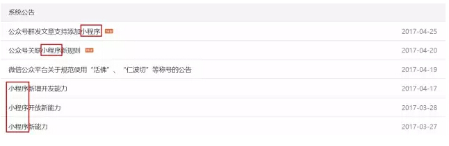 關于小程序的系統公告多達5條之多