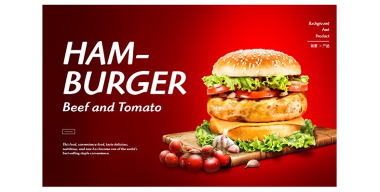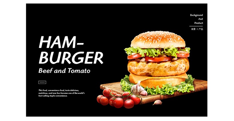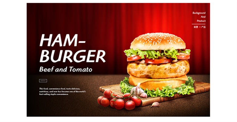 模擬一個(gè)漢堡的畫(huà)面,分別以純顏色背景、場(chǎng)景背景、漸變背景、材質(zhì)背景進(jìn)行設(shè)計(jì)