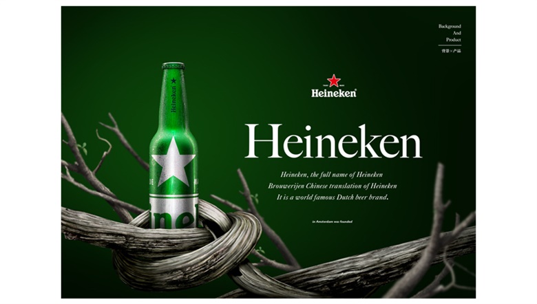 灰色調(diào)的綠作為純顏色背景,主體是經(jīng)過(guò)塑造的啤酒瓶,兩者顏色雖然屬于同一色系,但是在色調(diào)上產(chǎn)生對(duì)比,同樣起到突出主體的作用。