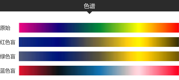 正如你可以看到的,有兩種最常見類型的色盲人群(綠色盲和紅色盲),在他們看到顏色的方式上并沒有發(fā)生根本性的變化。從色譜上我們不難看出色盲人群對于色覺識別上的一些規(guī)律: