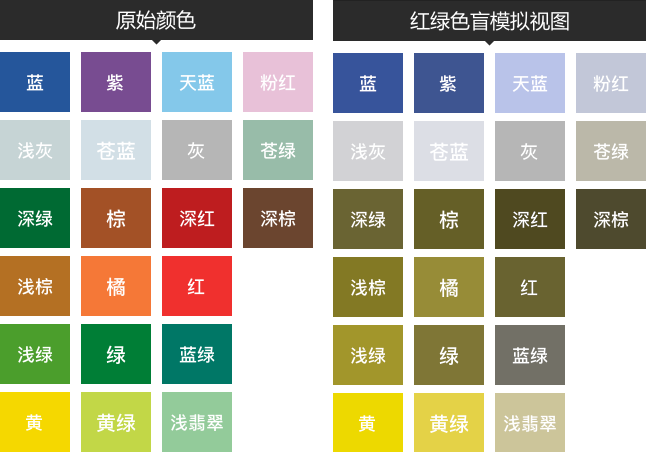 紅色在紅綠色盲眼中近似于深灰色,而藍色盲眼中的黃色近似于灰白色。