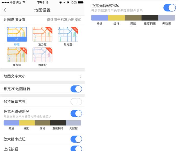 除卻對于界面配色的研究探索,我們甚至也可以為色盲人士提供單獨的色盲模式切換,這樣也可以兼顧視覺上的美觀,避免了太多信息的干擾。這種形式在游戲和軟件中也有先例,在APP設計中,高德地圖的色覺無障礙也屬于色盲模式切換的嘗新探索之舉。