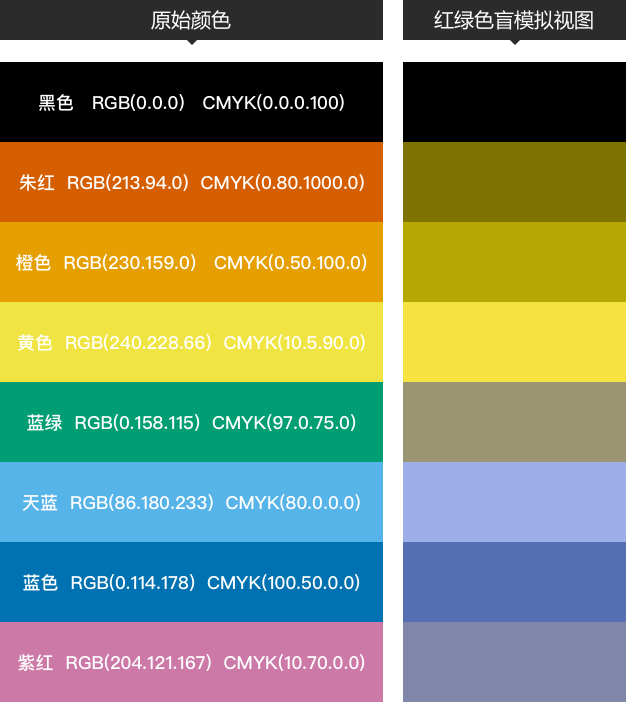 當同一界面需要出現多種顏色時,要使配色能覆蓋到各種色覺辨認能力的人(包括色盲、色弱和色覺正常的人群)并不是一件容易的事,這讓設計師非常頭疼。針對色盲人士的較弱顏色識別能力,日本研究得出一組無障礙配色建議,與高德地圖的色覺無障礙地圖設計的配色有異曲同工之處。這組配色對色盲和非色盲人群都是易辨識的(例如它選擇了朱紅色代替紅色,藍綠色代替綠色,紫紅色代替紫色,有效減少了色盲人士的困擾),它對屏顯和印刷都適用,在此分享,供大家參考。