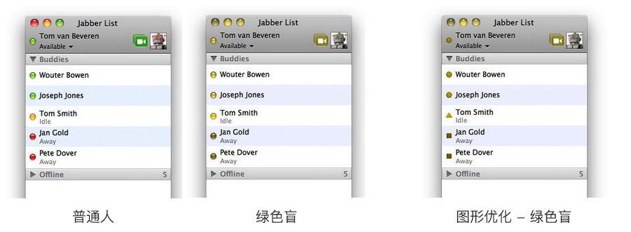 在ichat的優(yōu)化界面設計中,遵循的原則便是:使用盡可能少的顏色——結合使用不同形狀符號和少量鮮艷的顏色,效果遠好于只使用一種形狀和多種顏色。因此優(yōu)化改進的界面可以傳送足夠的信息,即使沒有顏色。例如,當一個全色盲在瀏覽界面時,該界面也不會丟失任何信息。