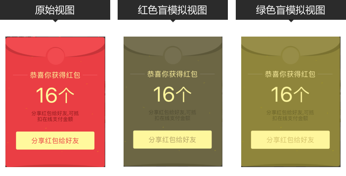 紅包是我們日常最常見的營銷手段,黃+紅也是最直接的配色,但在紅綠色盲的世界里,紅色近似于灰色和黃灰色,于是在設計此類頁面時應該拉開配色明度與對比色,重要的文字信息更應該避免出現 紅色+深灰色 的配色。