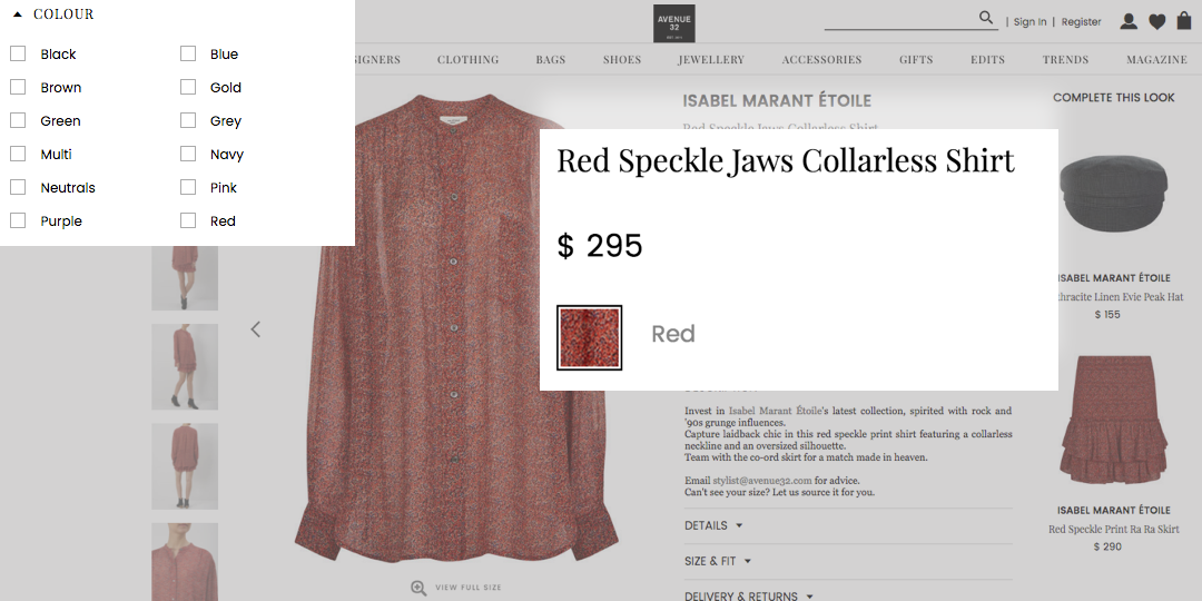 盡管這似乎是一個好主意,但重要的是要記住,不是所有訪問該網站/應用程序的人都是同一類別。對于具有正常視力的用戶,當他們看到過濾器中的顏色時,這是一個很好的體驗。當客戶只想盡可能快速順利地查看搜索結果時,去除色板可能會減慢選擇顏色的相互作用。