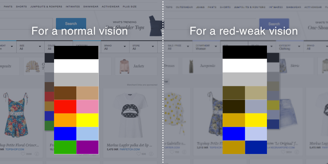 另一個常見的問題是濾色鏡未標記!以下是一個眾所周知的電子商務網站的示例,其中包含了為標記的彩色濾鏡。另一方面,我也反映了一個有紅色弱視問題的用戶體驗網站的方式。