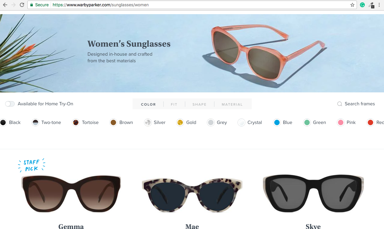 最佳解決方案包括色板和常用顏色標簽的組合。WarbyParker網站的眼鏡就是一個很好的例子。
