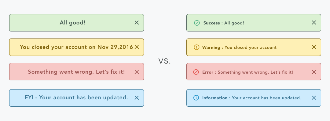 不僅僅是表單,提醒消息也是。我們往往傾向于將成功和失敗的消息分別顯示為綠色和紅色。但使用諸如“成功”之類的前綴文本或圖標可以快速輕松地閱讀,如下所示: